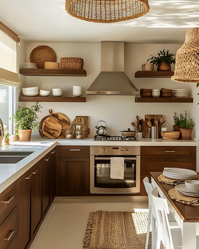 The harmony of functionality and the return to nature is reflected in open wooden shelves. Shelves blend function and style with plates, wood, and greenery. Objects organized at eye level ensure easy access while providing visual balance. The empty space ratio of the shelves and the simplicity of the chosen objects prevents visual clutter. Walnut-toned cabinets and white countertops reflect warmth on a modern base. At the same time, they remind us of the harmony of contrasting tones. Thanks to the open shelf arrangement, the kitchen becomes both spacious and photogenic. The essential element of the shelves, plants, evokes nature and awakens a sense of vitality.
