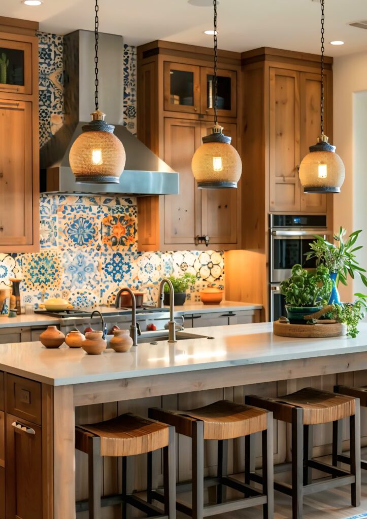 Patterned tiles have become one of the most aesthetic ways to give character to a kitchen. Traditional motifs combined with modern interpretations create a unique vibrancy in the space. In kitchens designed with natural tones, the use of patterned surfaces balances to create a warm yet dynamic atmosphere. Wood cabinets paired with bold patterns create a warm, refined look. Earthy greens and blues bring balance as both foundation and detail. Patterns function not only as decoration but also act as a narrative language full of life energy. Modern fixtures, simple countertops, and natural textures balance this liveliness, resulting in a refined outcome. Every detail reflects a harmony between past and present. This approach transforms the kitchen from merely a place for cooking into a living space with soul. Natural tones blended with patterned tiles add an inspiring warmth to modern kitchens.