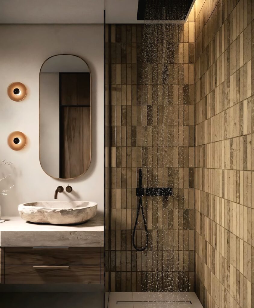 Hard lines dominate many bathrooms—tiles, cabinets, hardware. A curved bathroom mirror breaks this repetition. Additionally, it invites visual softness. Inspired by natural forms, curves evoke water, wind, and movement. As a result, the space feels more relaxing and alive. Even a small bathroom benefits from a mirror with a rounded frame. It opens the space visually, especially when placed opposite a window or light source. Moreover, pairing it with wall-mounted faucets and oval basins creates harmony. Rounded silhouettes speak the same design language. For balance, consider adding vertical lighting on either side. This not only highlights the curve but also improves facial illumination. A well-placed mirror can elevate both function and experience.