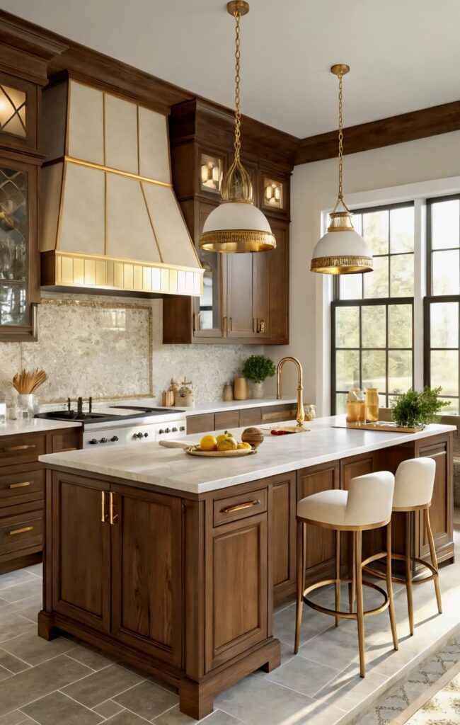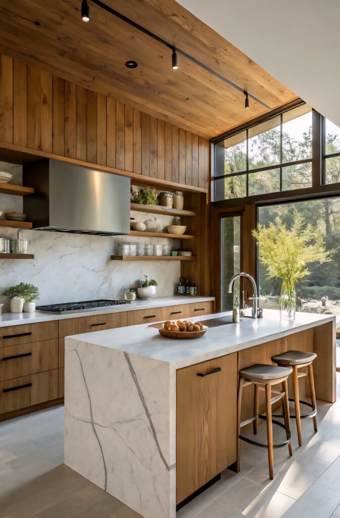 Light marble adds natural elegance to wooden kitchen designs. Warm wooden textures balance marble’s simple structure. These designs blend perfectly with light, creating a fresh look. Classic and modern details come together in timeless harmony.