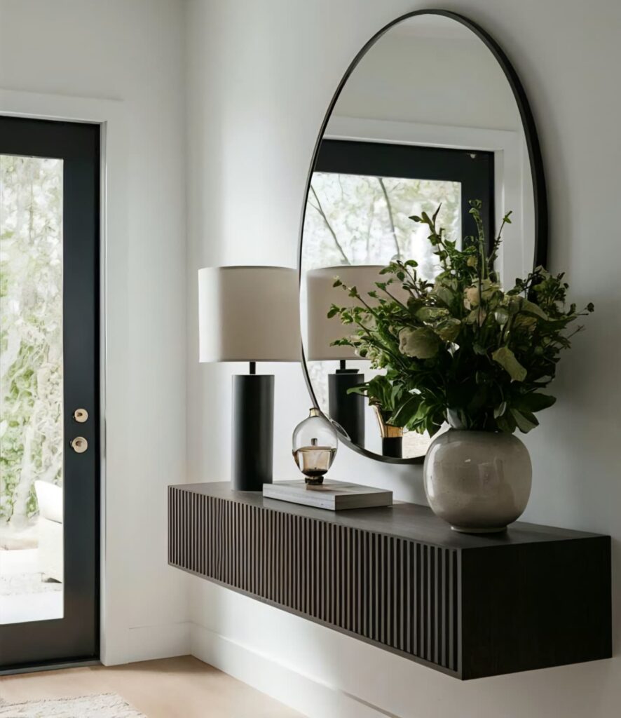 Modern console table ideas offer an airy look with wall-mounted designs. The legless structure creates a spacious feel while keeping modern aesthetics. A curved mirror adds an organic form and a soft visual flow. Stylish table lamps and fresh flowers elegantly complete the design. Clean lines and matching accessories add a sophisticated touch to the entryway.