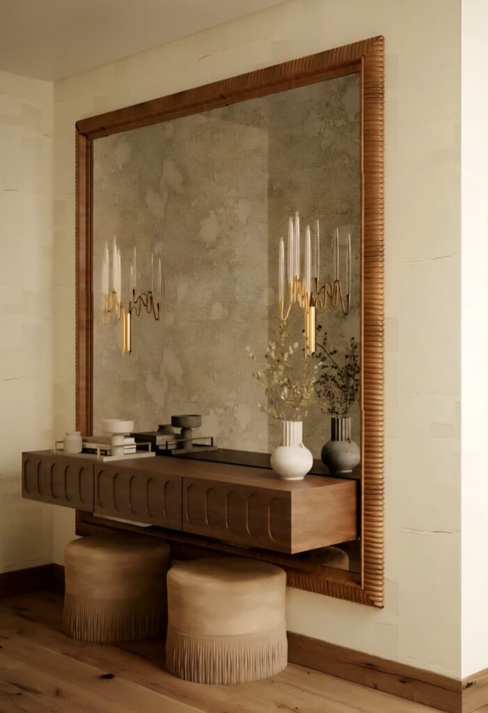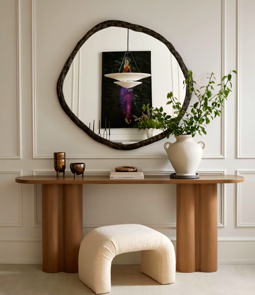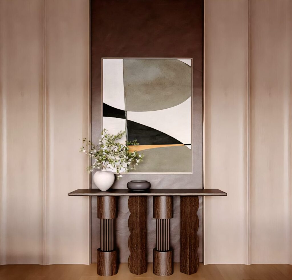 Light or dark wood consoles adapt well to any interior scheme. In modern console design ideas, wood introduces warmth and timeless elegance. Pair with organic shapes for a softer, inviting visual balance. Additionally, match tones to your wall for a harmonious, cohesive look. Fresh greenery or abstract art completes this stylish entryway composition.