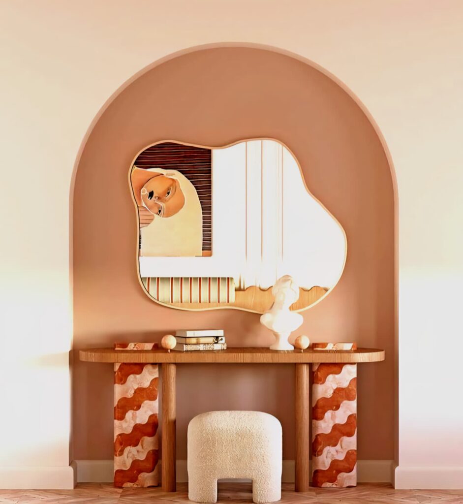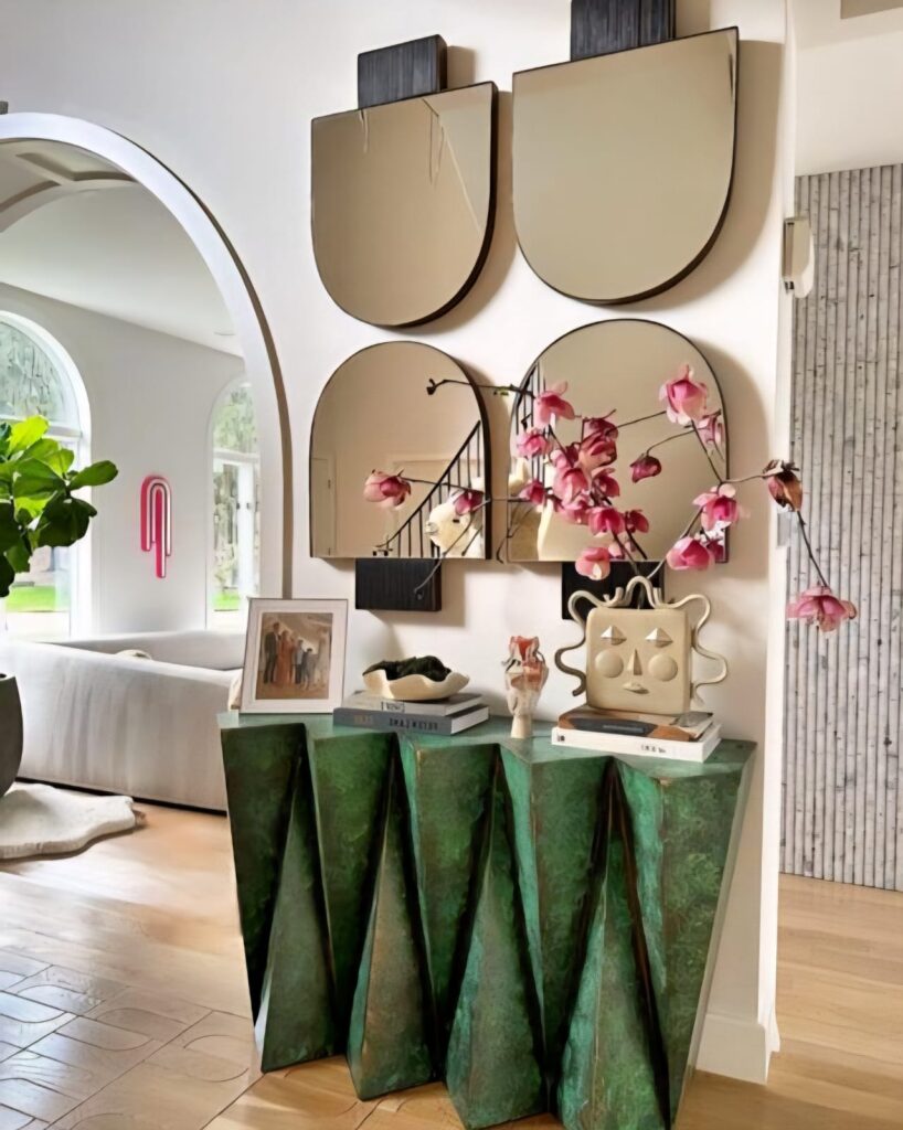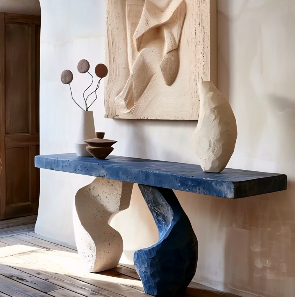 Modern console table ideas add an artistic touch to living spaces. Colorful surfaces and sculptural legs create a unique character in rooms. Organic forms blend with natural textures for balanced visual harmony. Decorative objects enhance the design and strengthen modern aesthetics. Bold color choices turn the entryway into a captivating focal point.