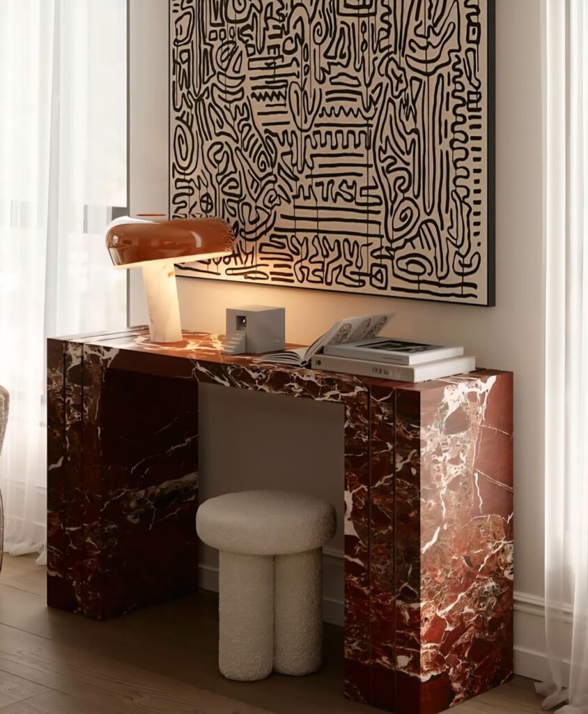 The grace of marble adds timeless luxury to modern console table ideas. In the first design, gold legs match perfectly with black and white marble. Accessories in metallic tones enhance its refined elegance. In the second, deep red marble creates a bold artistic statement. Warm lighting and modern art complete its sophisticated look.