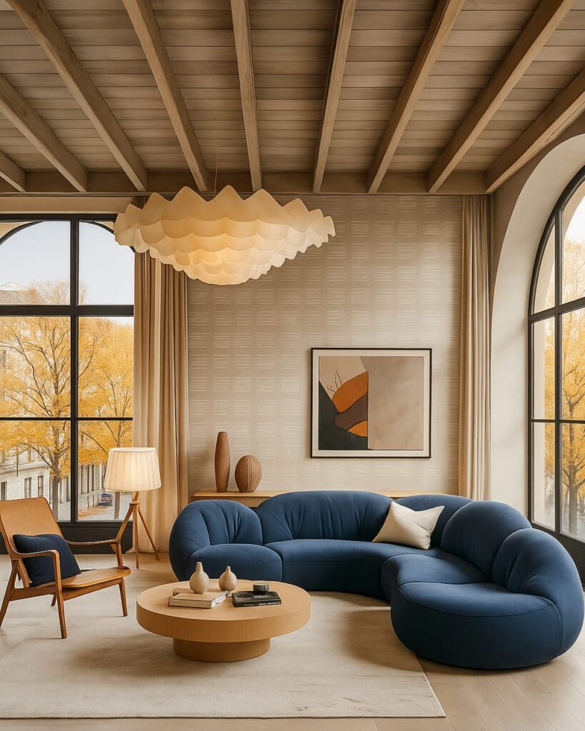 With sunlight pouring through the tall windows, every material feels alive. Natural fibers glow warmly, and navy blue gains a refined depth. Therefore, this design combination feels complete, elegant, and calming at the same time.