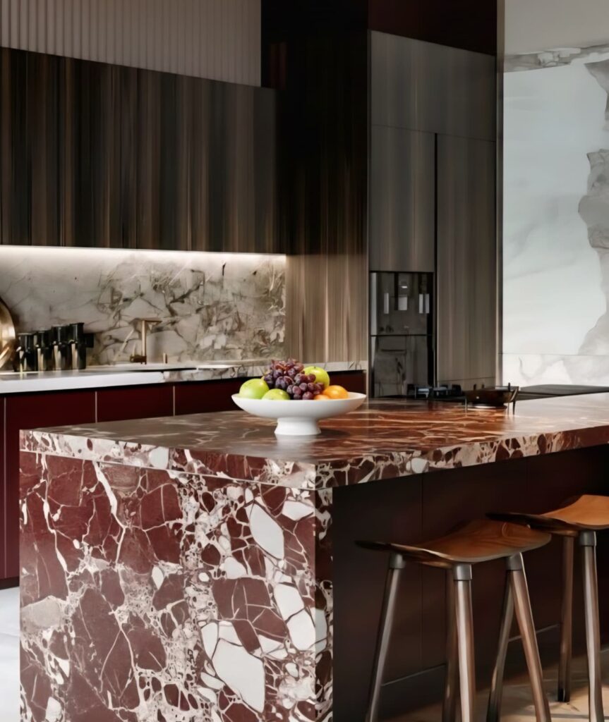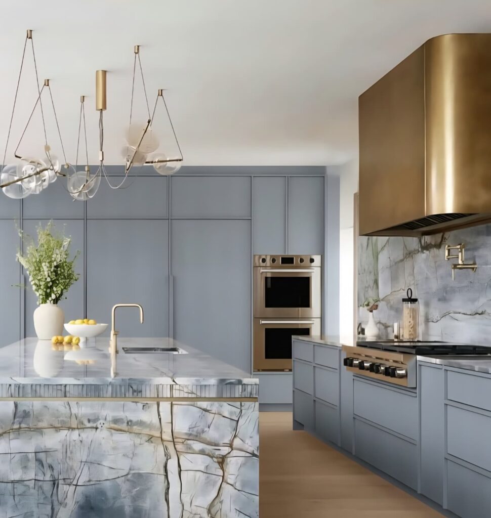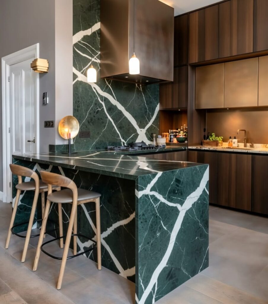This design approach highlights expressive materials in highly intentional ways. Because of that, a statement island instantly gains strong architectural presence. Bold countertops play the main role in this transformation. Natural stone creates depth and movement. Composite surfaces add color intensity and visual power. Thick profiles give the island a sculptural quality. Moreover, seamless joints improve the overall flow. Each element strengthens the island’s identity.