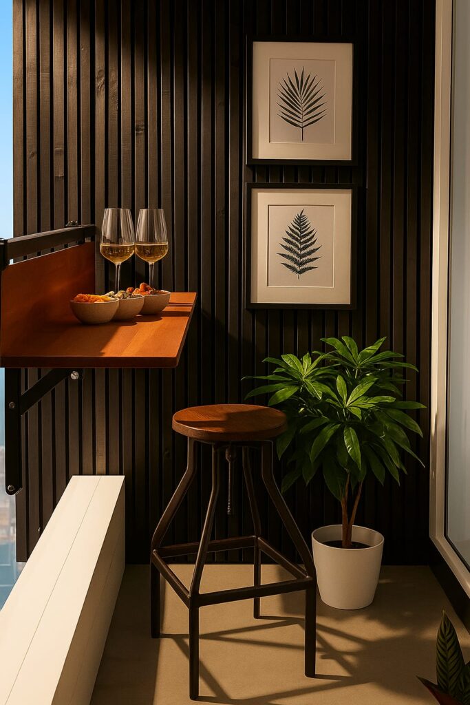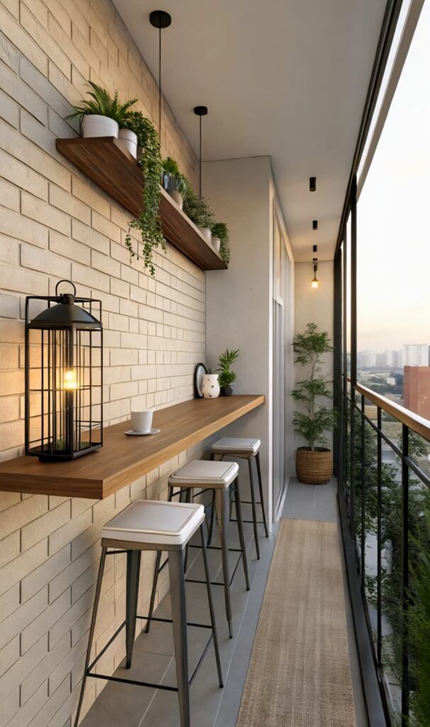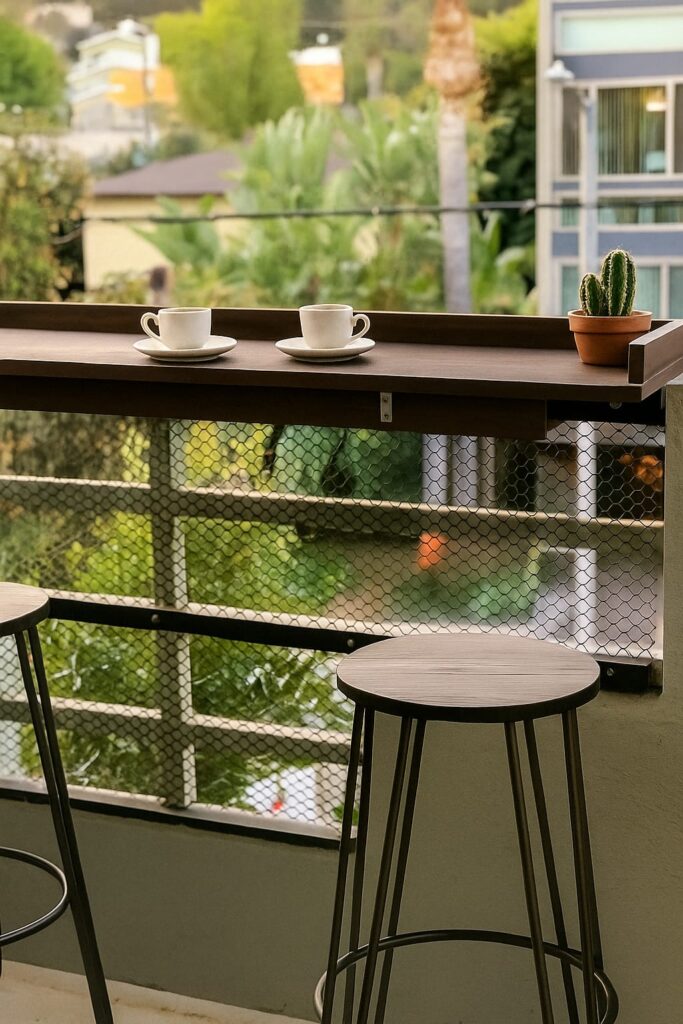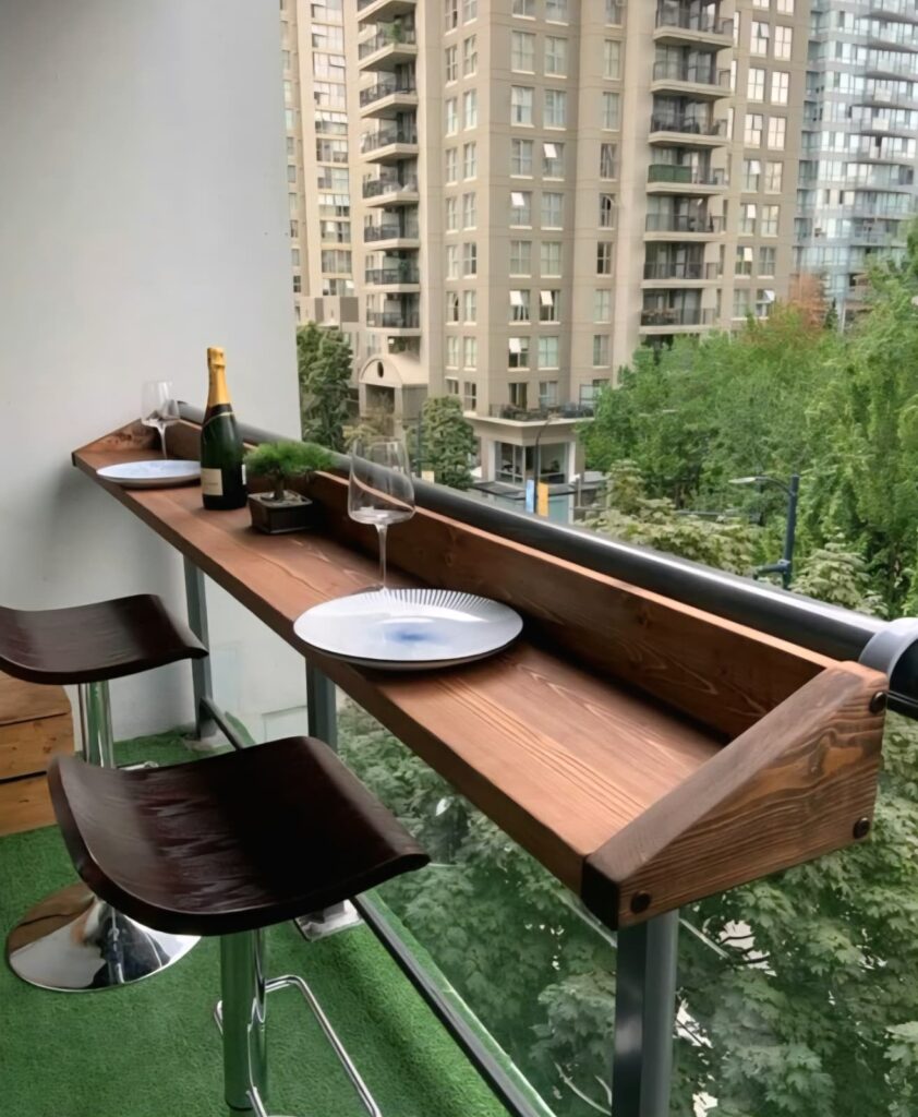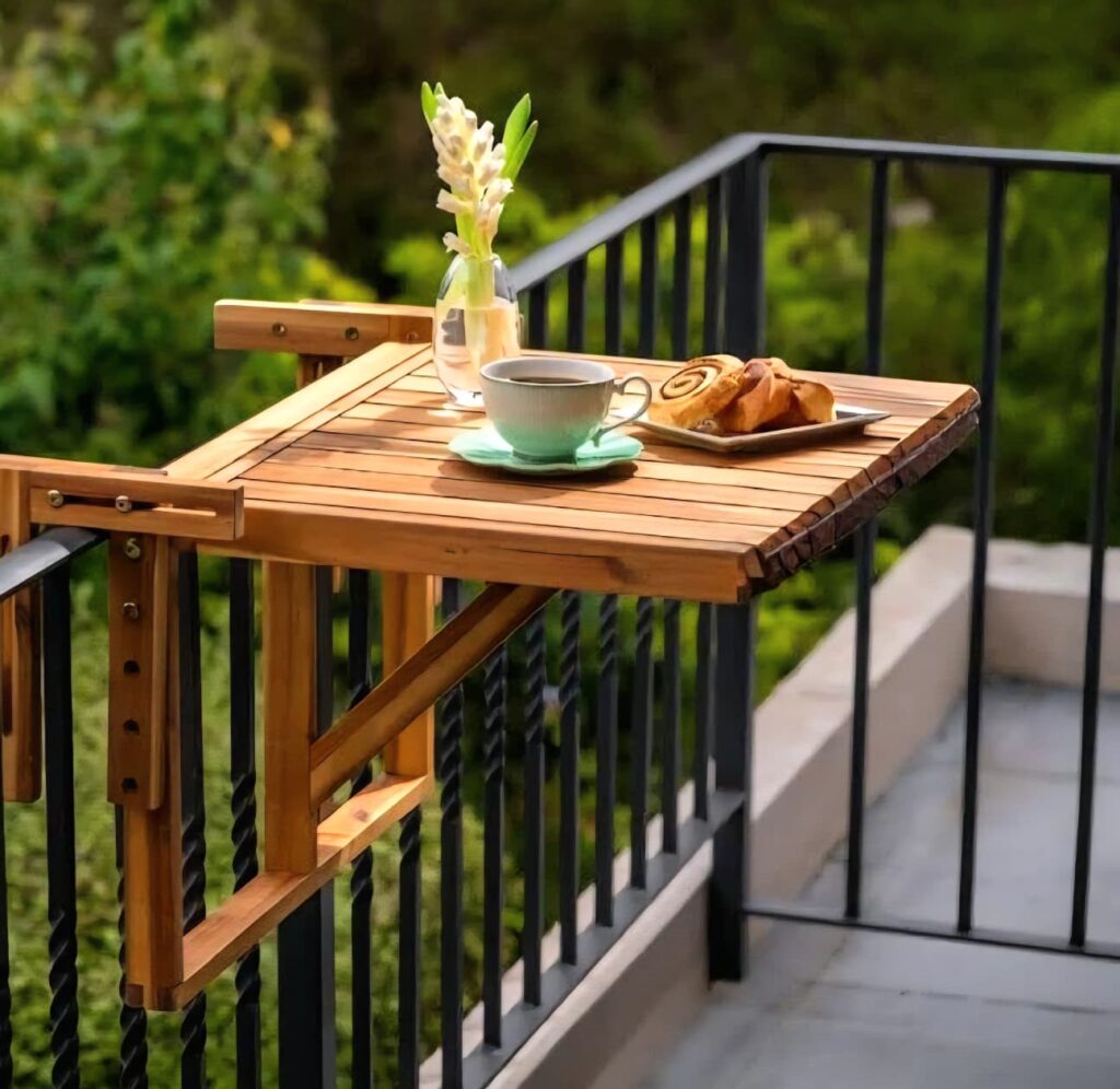 In small balconies, furniture functionality is crucial. Therefore, foldable or wall-mounted designs are highly recommended. Additionally, even in limited areas, a wooden bar table for balcony provides a stylish yet practical solution for enjoying your outdoor space.