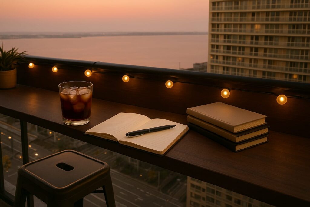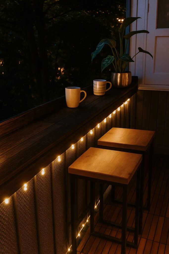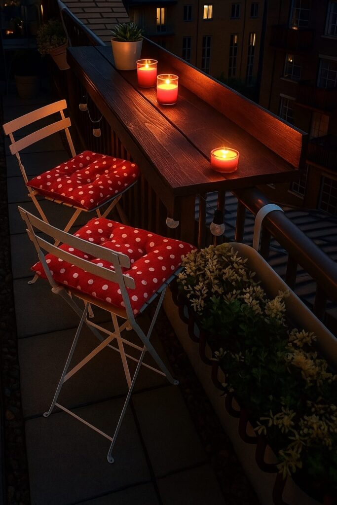 Balcony enjoyment is not limited to daytime. Especially, soft lighting from LED strips or candles adds warmth and charm. Moreover, a comfortable table surface lets you dine, sip drinks, or chat easily.