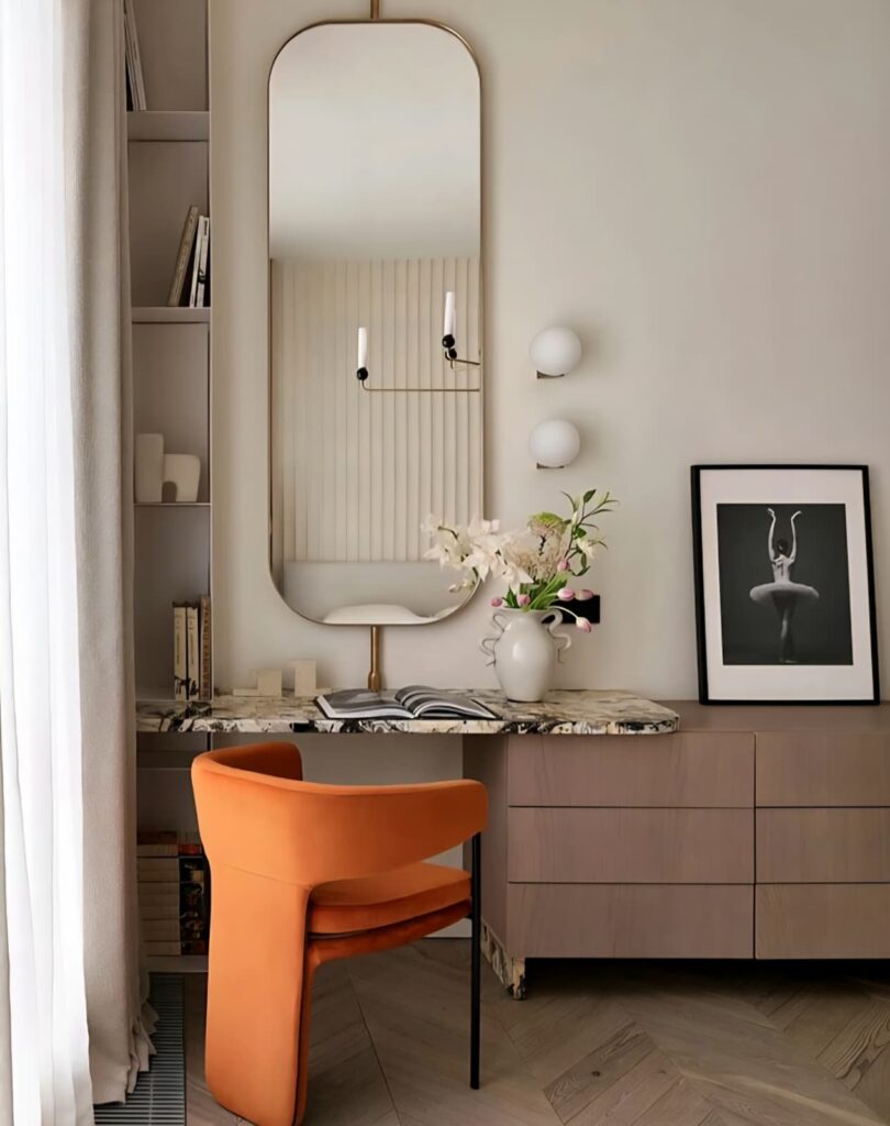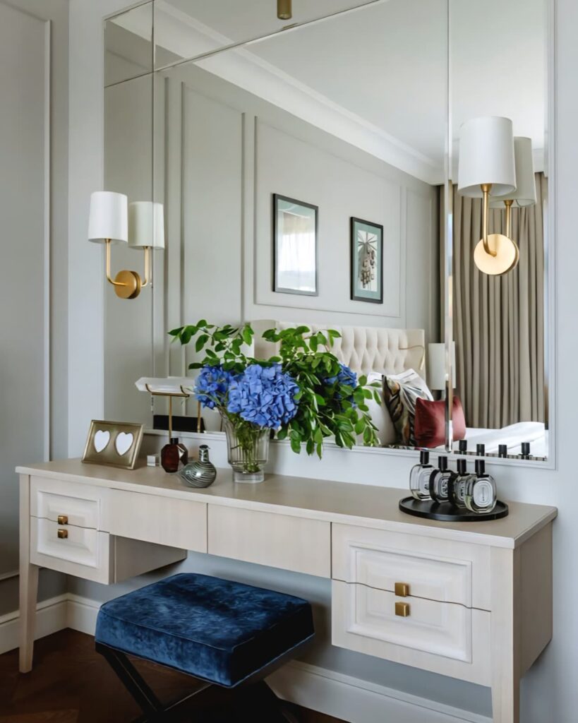 The seating element matters as much as the table. Velvet upholstered chairs with curved edges provide both comfort and elegance. In this way, makeup vanity designs become more than functional pieces; they shape the character of the room.