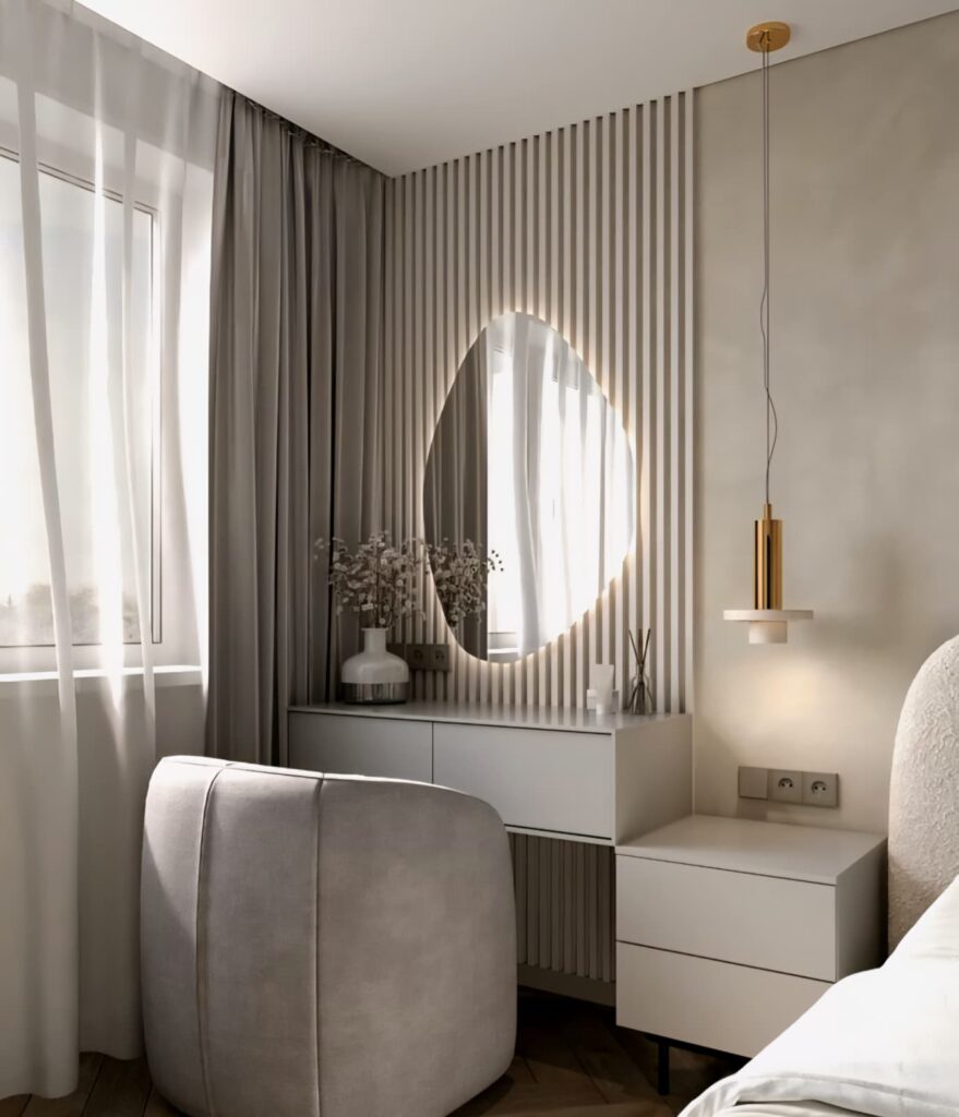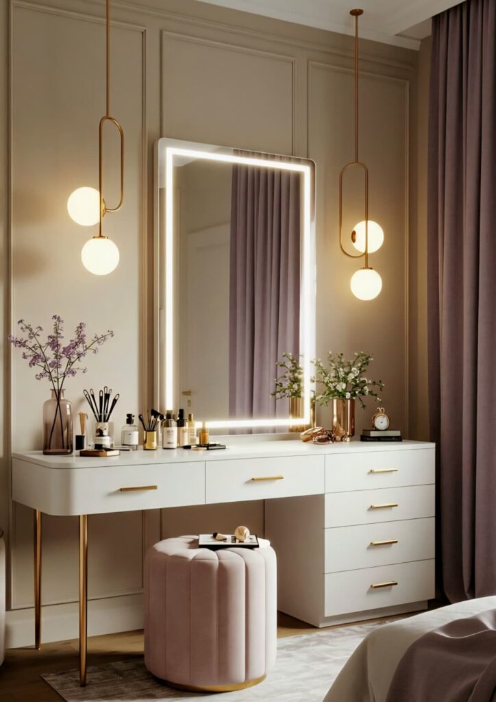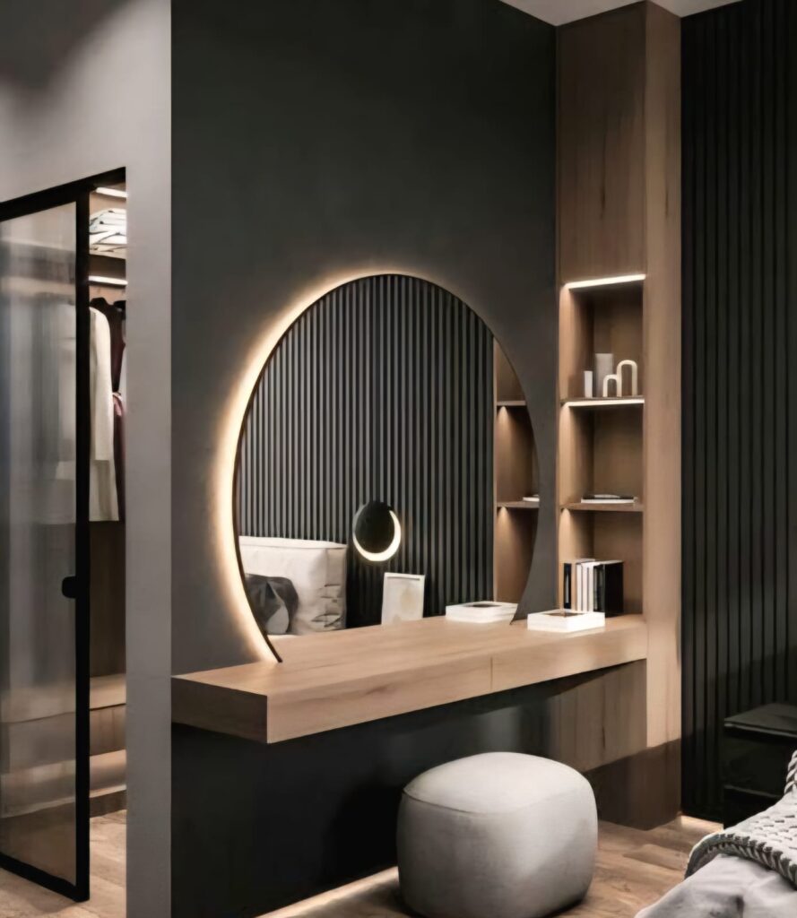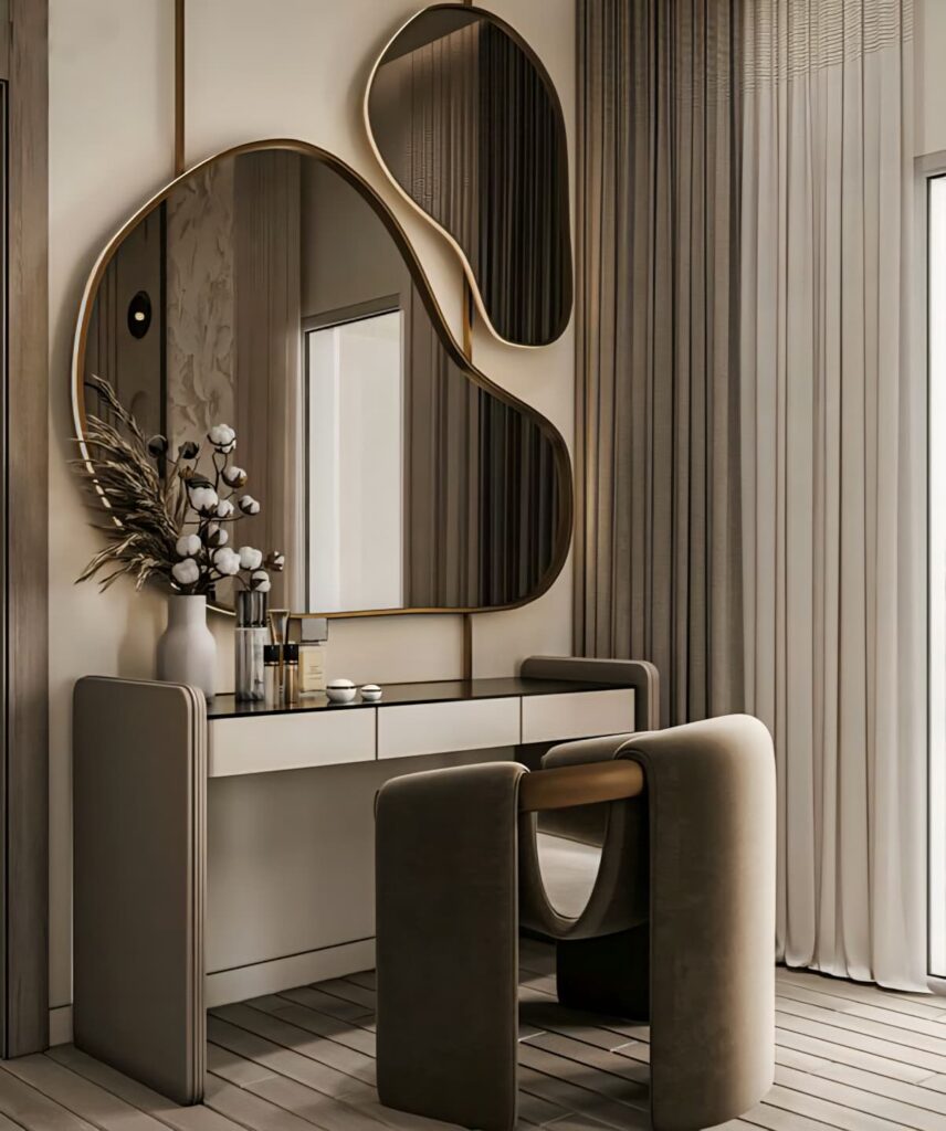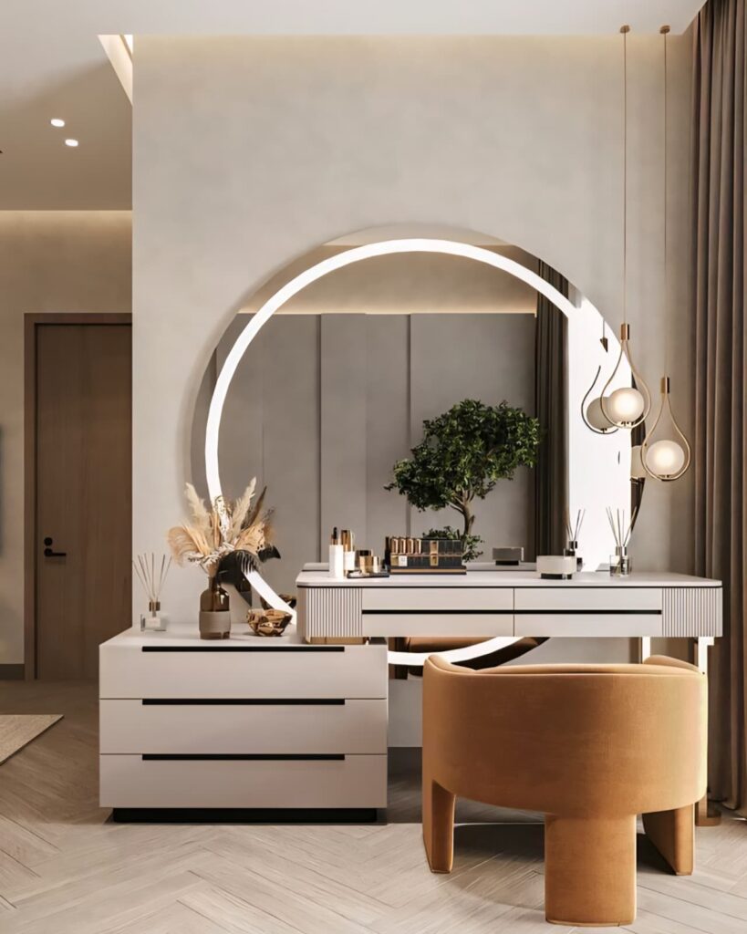 When exploring modern makeup vanity designs, the first striking feature is mirrors. Large circular or organic-shaped mirrors add depth and create elegant focal points. Simple lines in tables combine with matte or glossy finishes. Golden or brass accents give a sophisticated touch to the overall design.