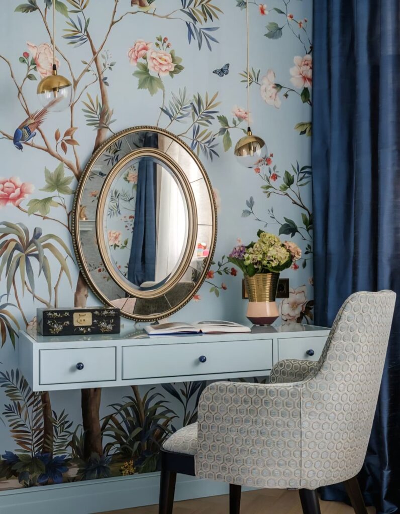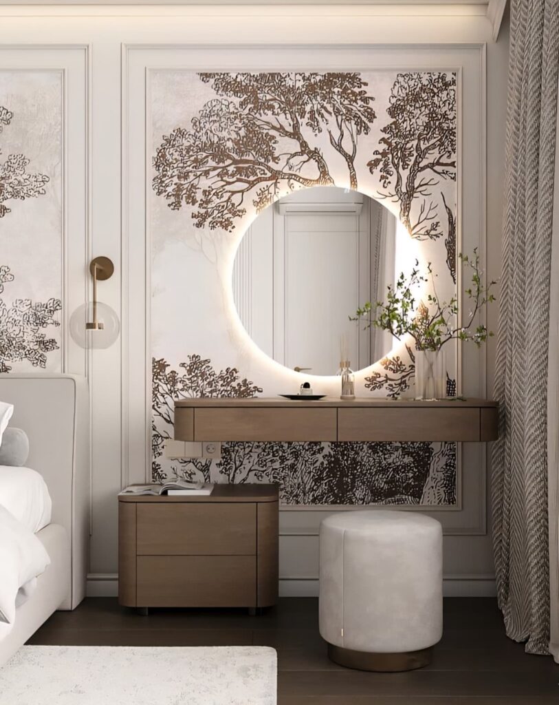 Designs can become much more striking with the right wallpaper selection. Colorful floral patterns placed behind the mirror bring vibrancy to the space. Minimal tones with tree or branch motifs create a calmer and softer ambiance. Paired with elegant lighting, the wallpaper adds depth and a sophisticated touch. This small detail transforms the vanity corner into both a functional and aesthetically pleasing area.
