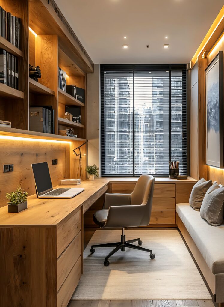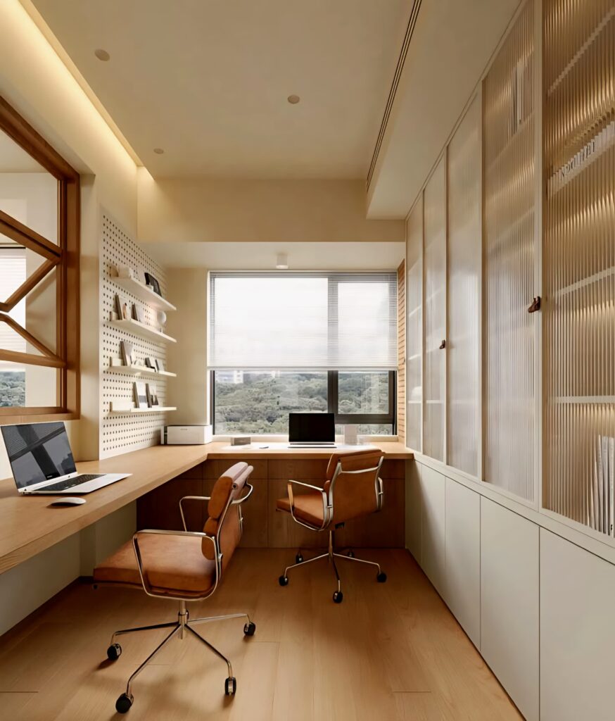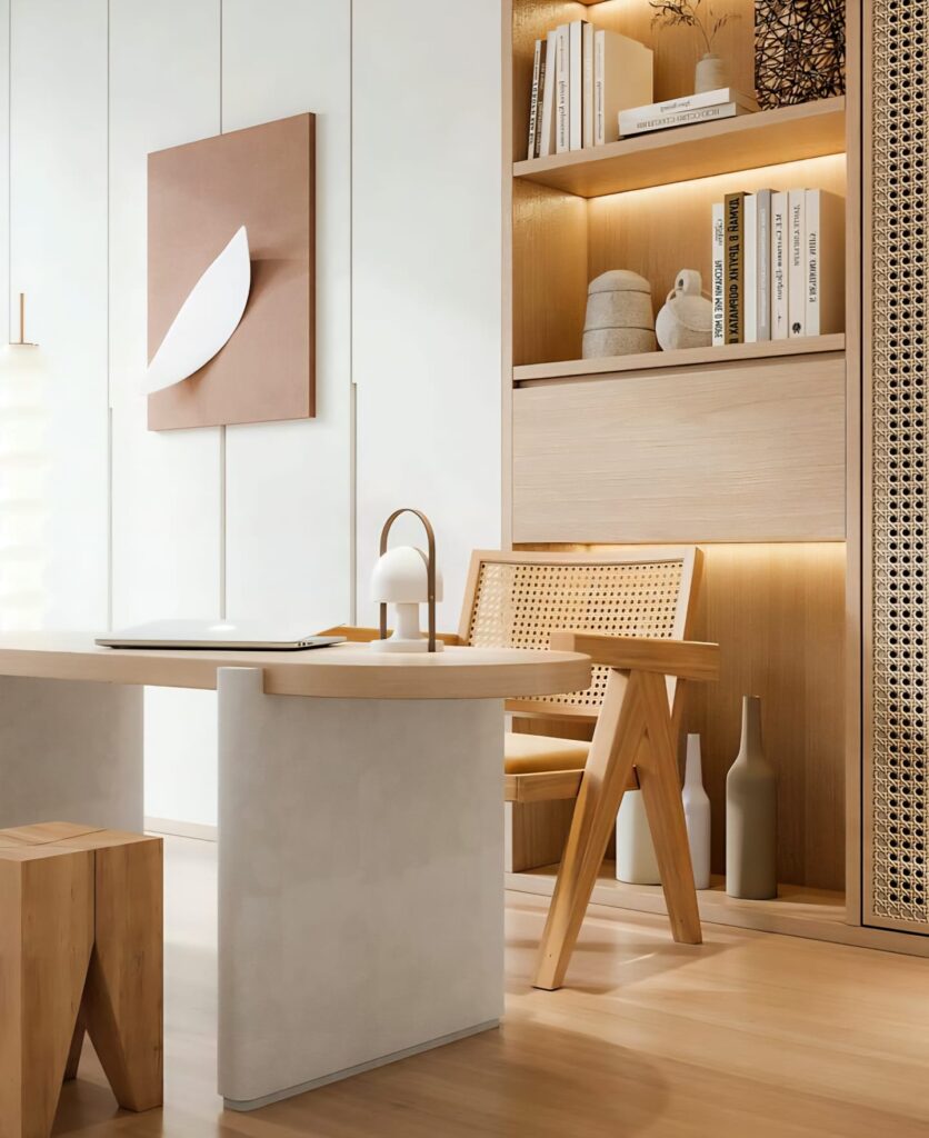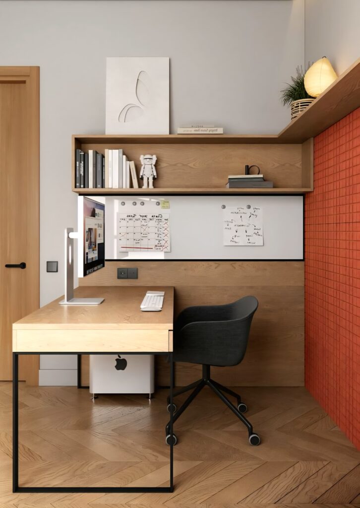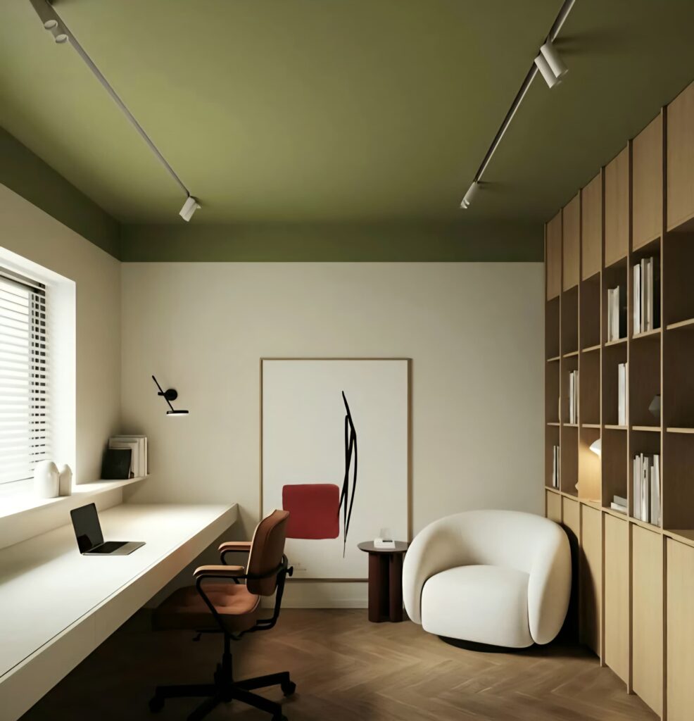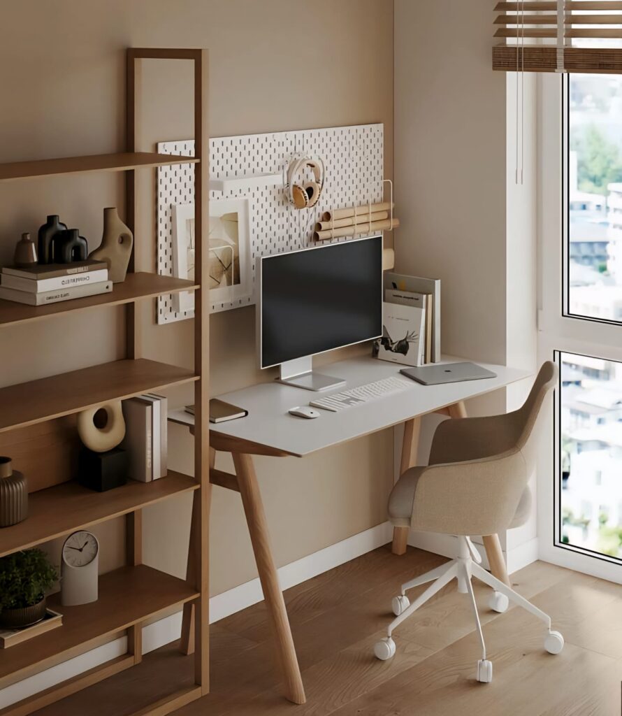 Using fewer but impactful pieces allows the room to “breathe.” Instead of unnecessary objects, opt for simple artwork, delicate lighting fixtures, and accessories with natural textures. In this way, a modern home office design is created. This approach reduces visual distractions and supports focus.