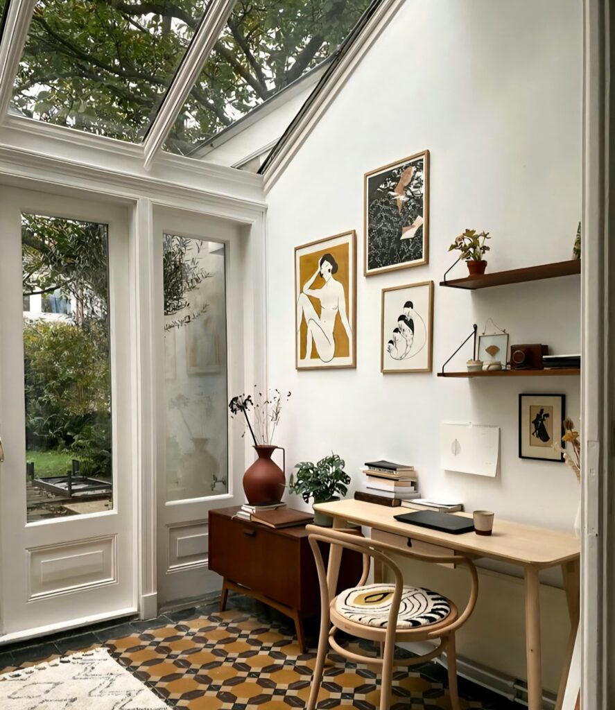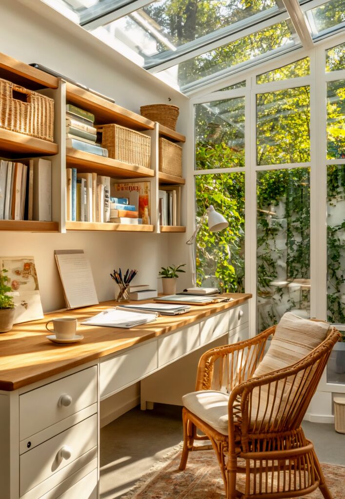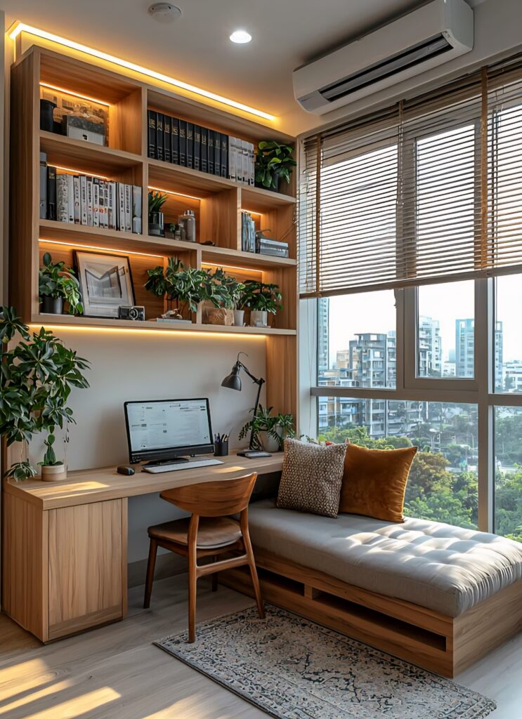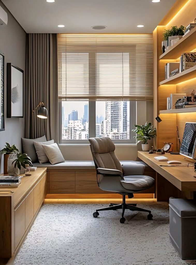 Large windows and sheer curtains that invite daylight define a modern home office. Placing the desk by a window boosts focus and clarity with natural morning light. Because natural light acts as an invisible guide for your brain’s biological clock—enhancing balance through serotonin and vitality through cortisol, ultimately bringing your mind to its most efficient state.